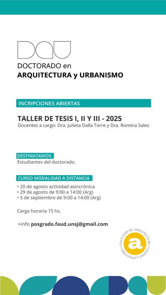 Se dictará próximamente el Taller de Tesis a cargo de la Dra. Romina Sales y Dra. Paula D´Amico para quienes se encuentran cursando el Doctorado en Arquitectura, Urbanismo y Diseño FAUD-UNSJ.